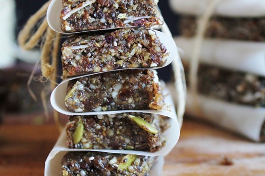نضيف الفاكهة المجففة ،زيت جوز الهند،و العسل و نستمر بالطحن حتى نحصل على عجوة متماسكة.