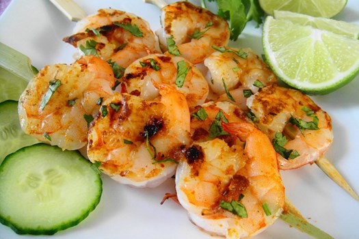 — ندهن سطح الشواية بقليل من الزيت،نشوي اسياخ الربيان حتى تنضج ٣ دقائق لكل جهة.
